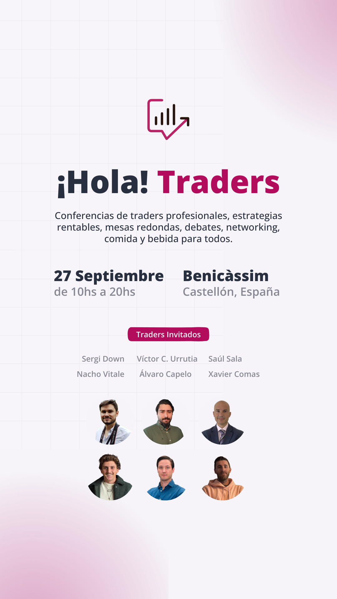 Conferencias de traders profesionales, estrategias rentables, mesas redondas, debates, networking, comida y bebida para todos.